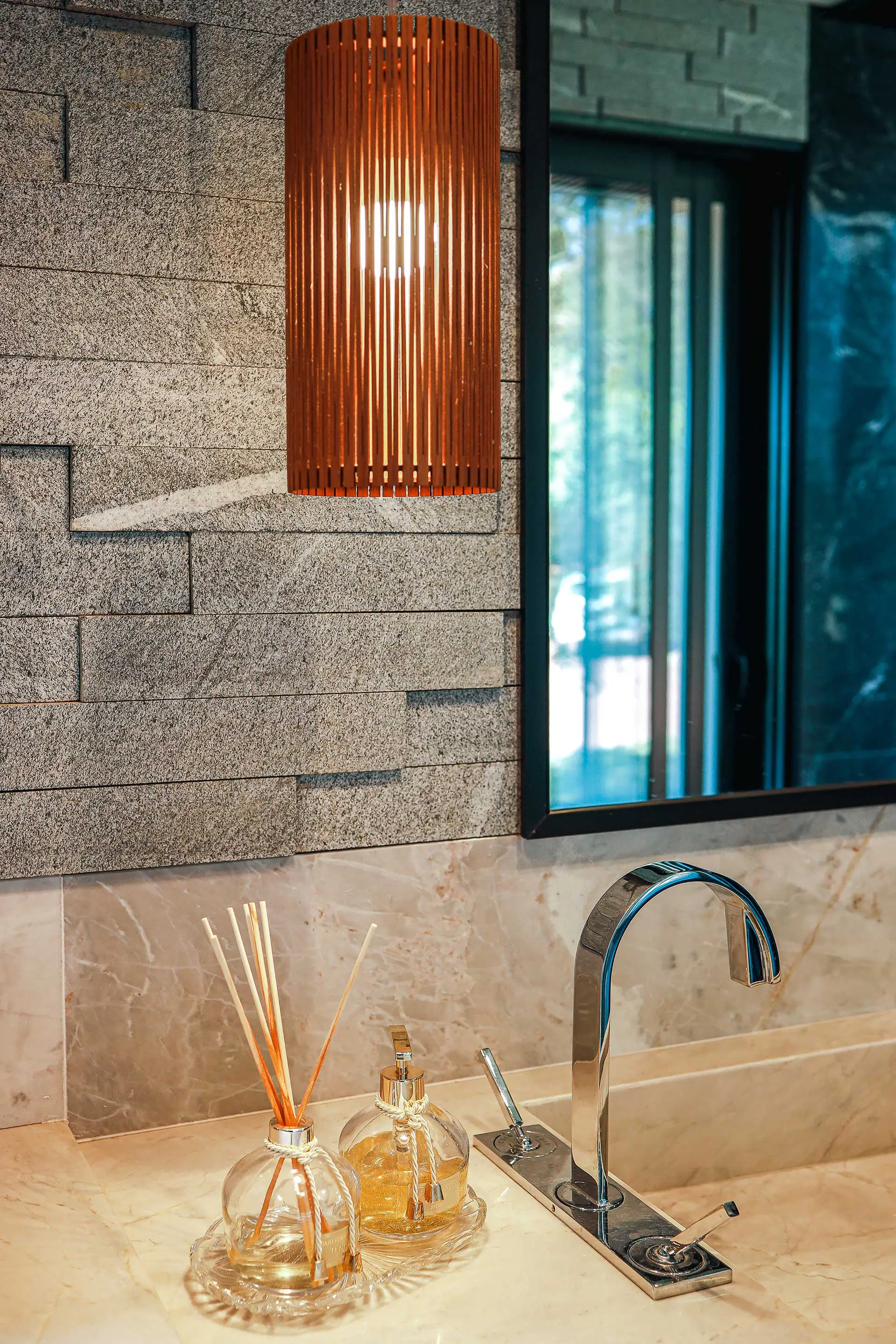 Interior de puro granito polido e ambientes integrados.