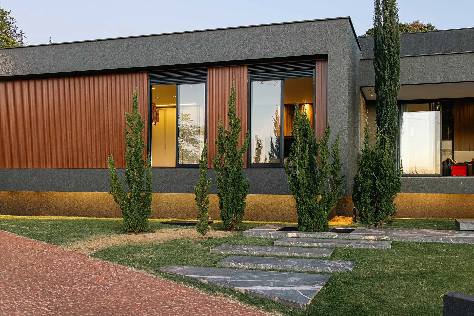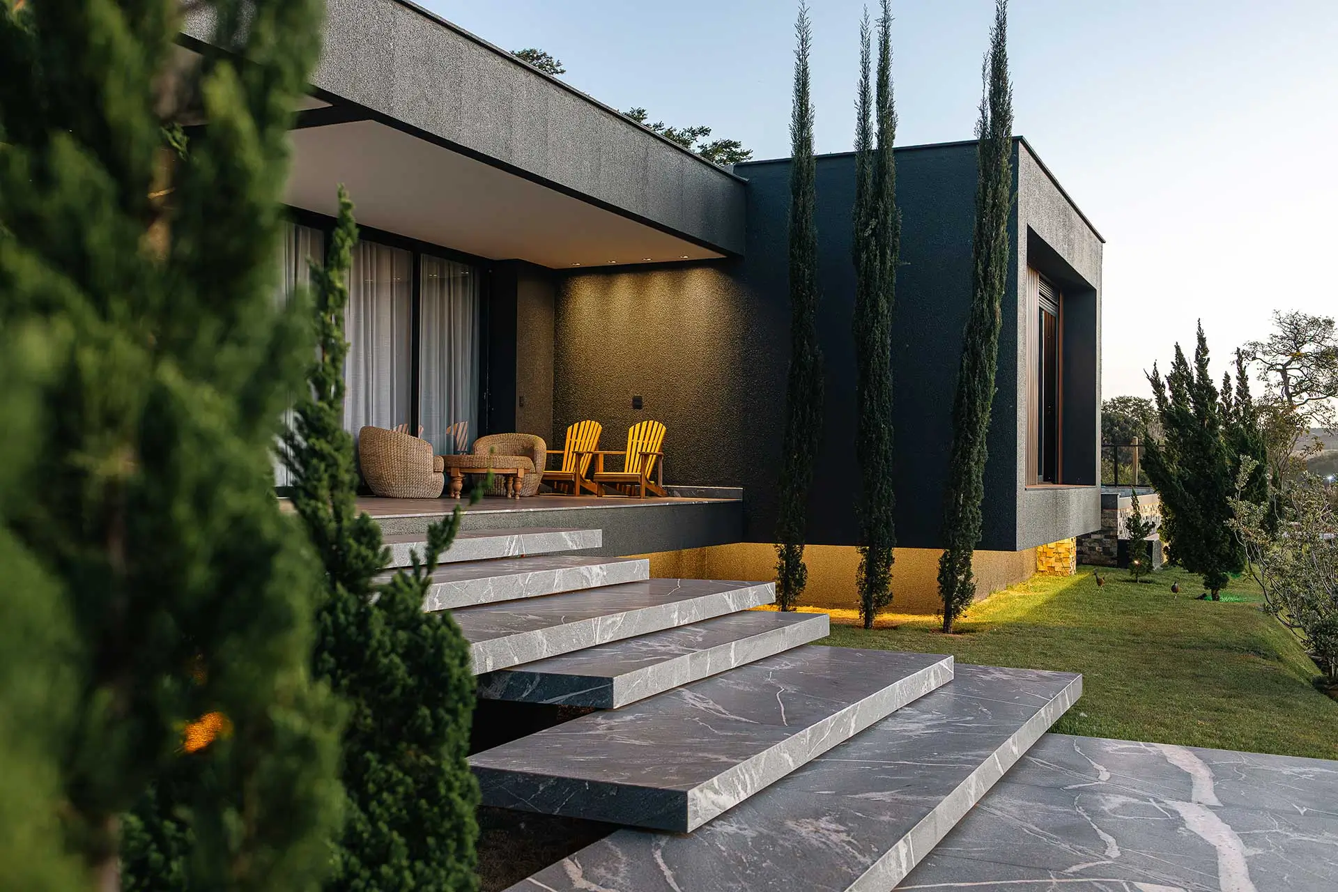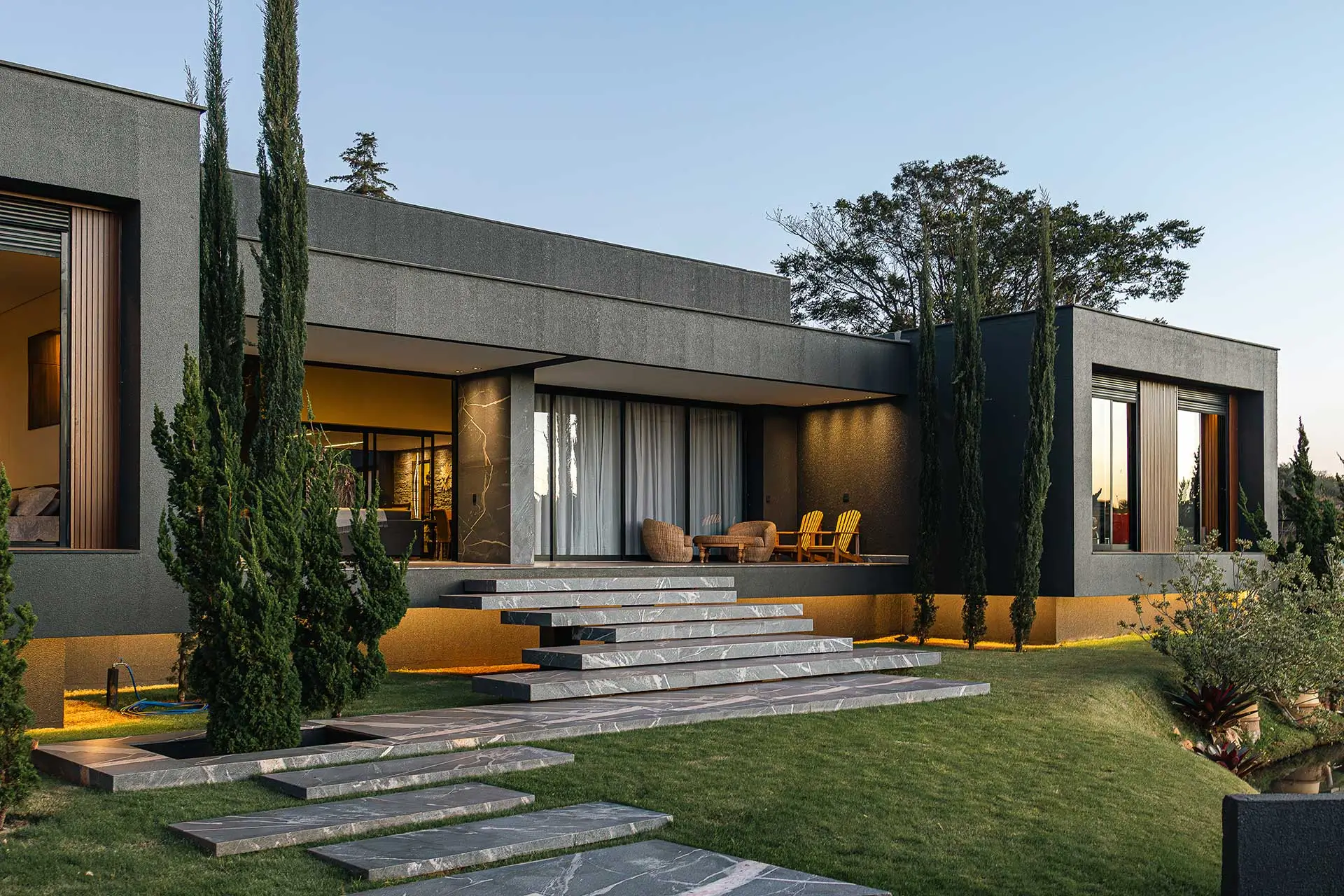 Pé-direito e lareira em granito; portas de 4 m que se abrem para a paisagem, transformando a sala em extensão do exterior.