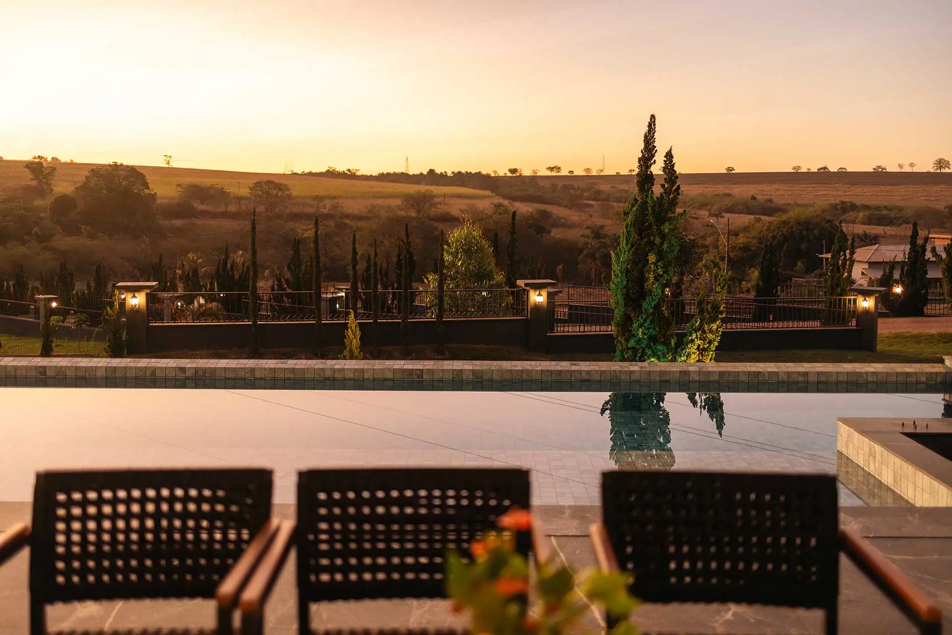A borda infinita une horizonte e convívio: 150 m³ de água refletindo céu e copas, onde o tempo desacelera.