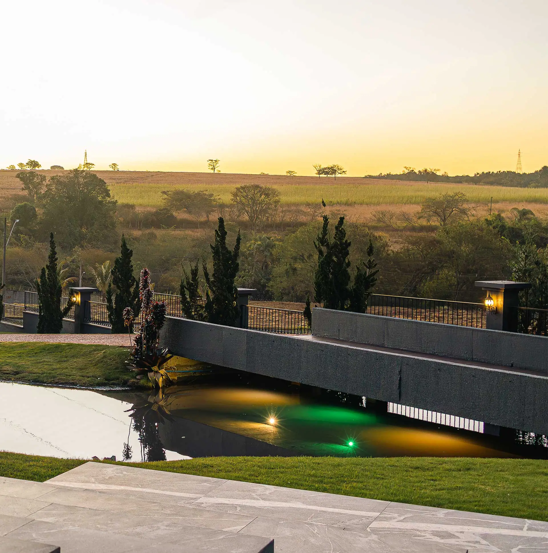 Uma travessia sobre o espelho d’água marca o início da propriedade.