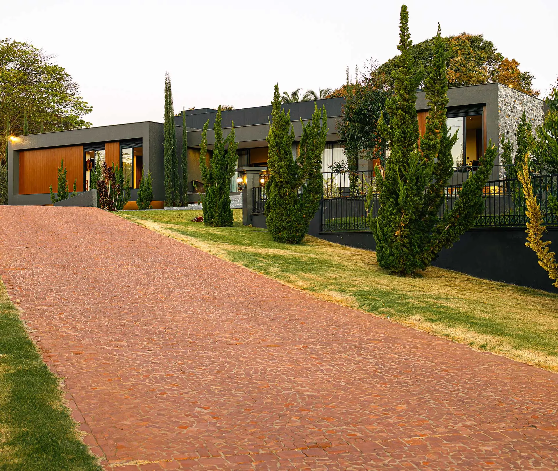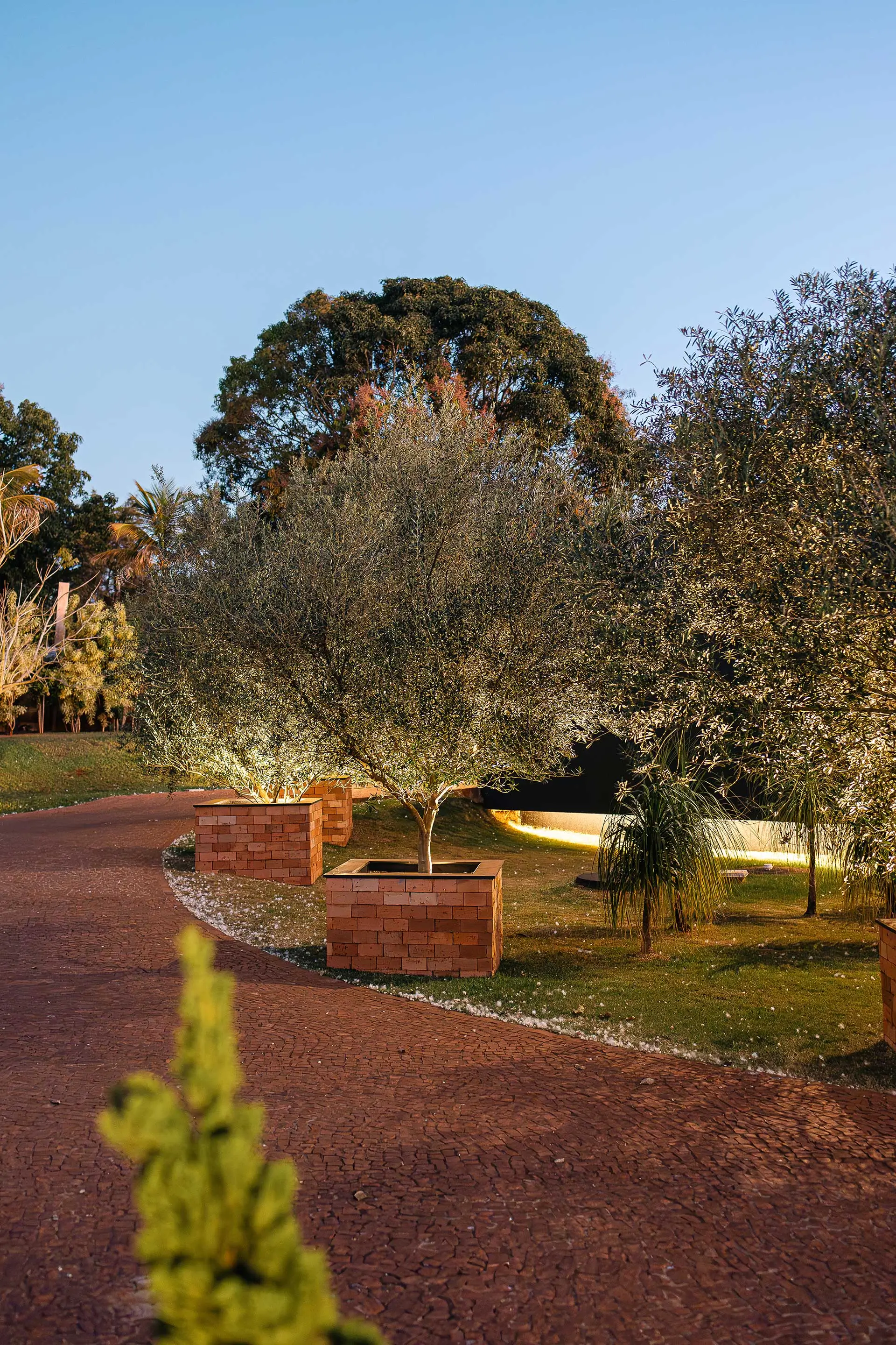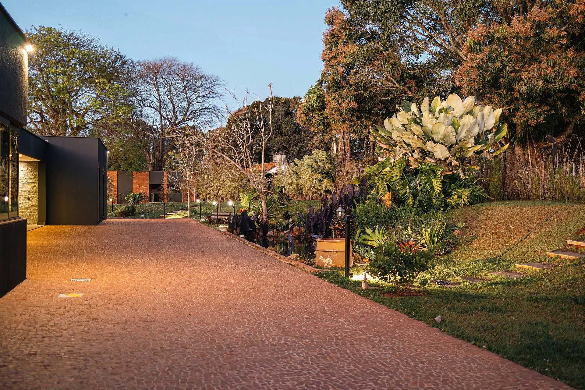 Calçamento em pedra portuguesa, ponte sobre lago e alamedas com kaizukas; a chegada é coreografada para impressionar.