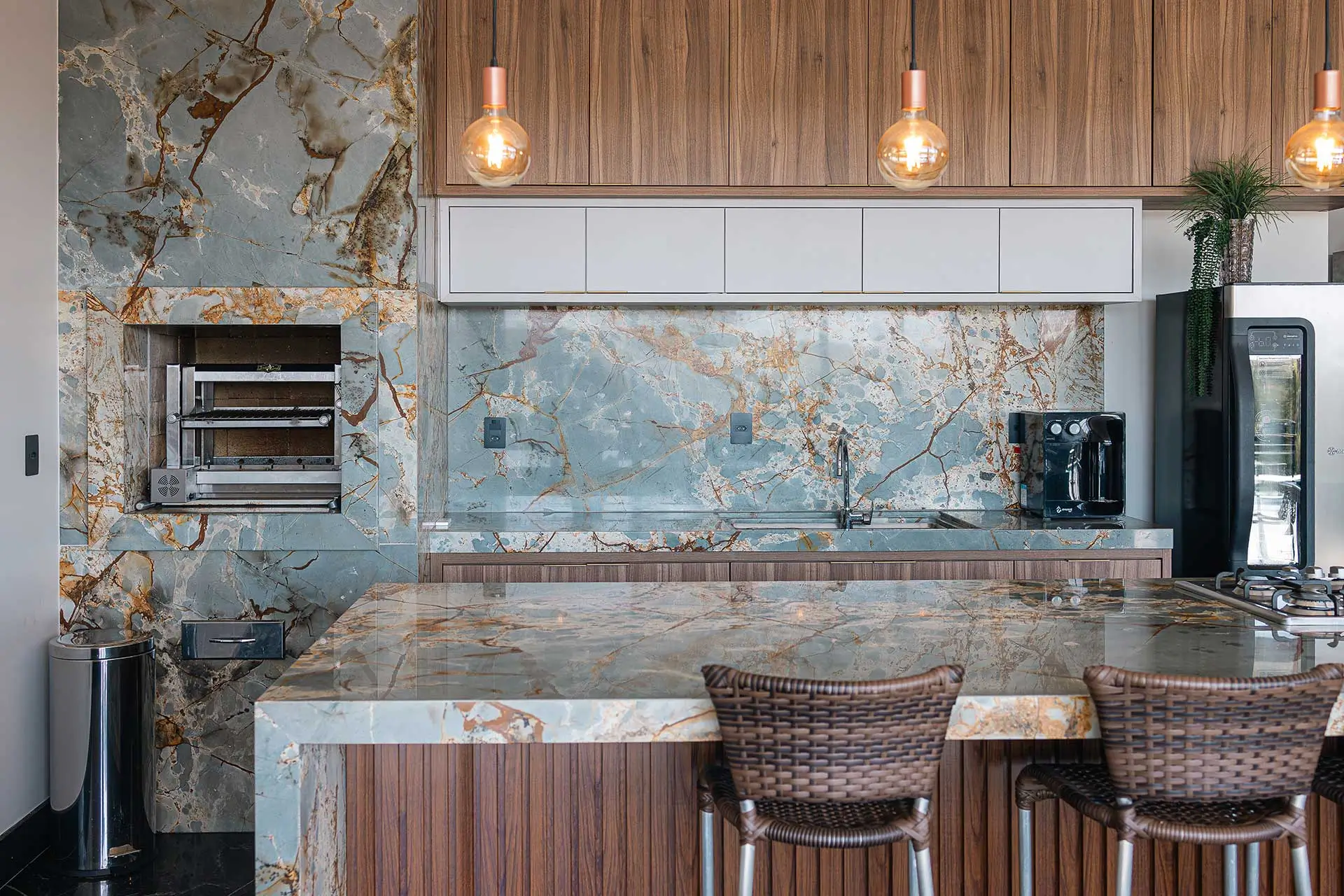 Armários laqueados azul, bancadas em mármore de exportação e circulação pensada para serviço e convivência.